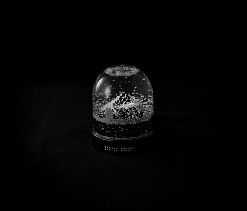 Trick of the fingers. A flurry of snow descendson a black mountain.